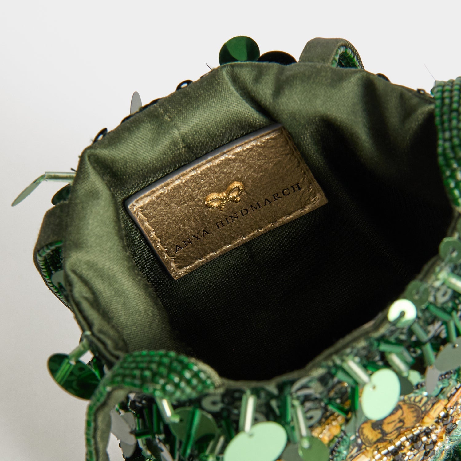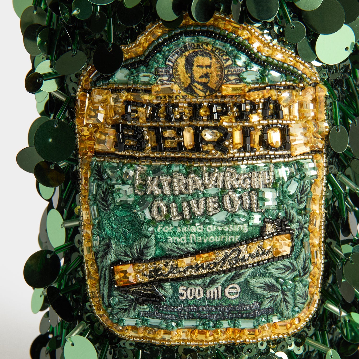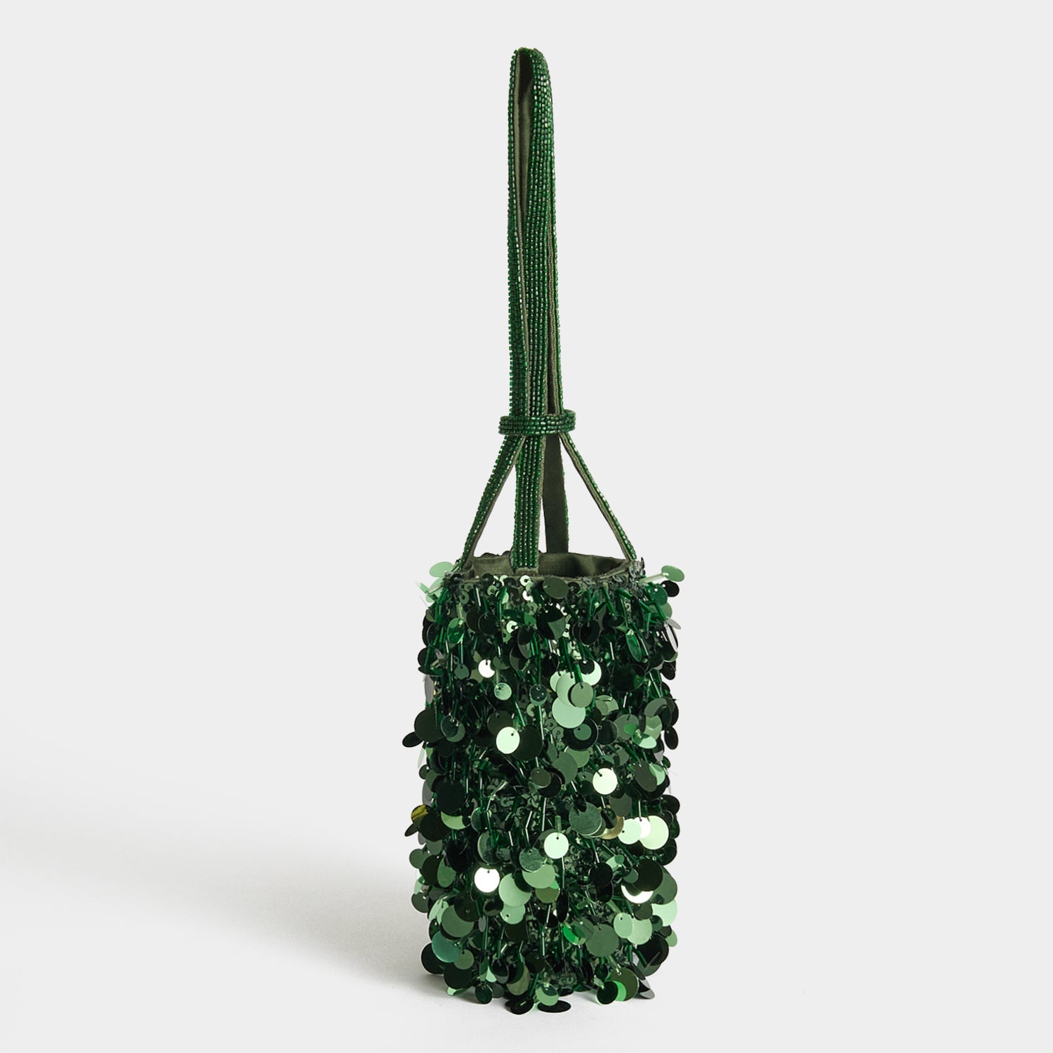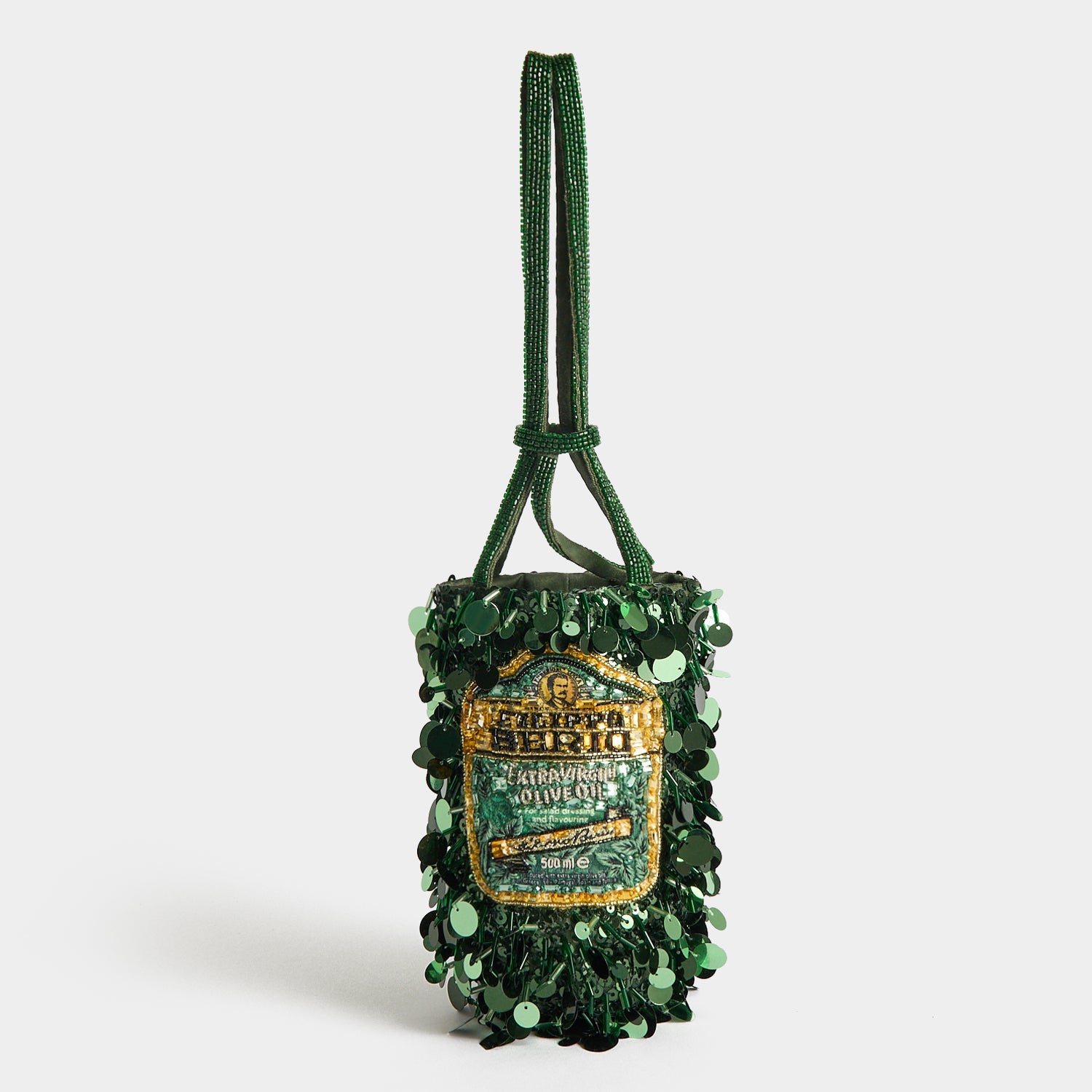 A refined take on everyone’s favourite olive oil, our Filippo Berio Mini Bucket bag is crafted in khaki satin, then delicately embellished with sequins and beads. Perfectly proportioned to carry your evening essentials – phone, keys, lipstick, cards – two beaded handles can be held, or looped over a wrist.