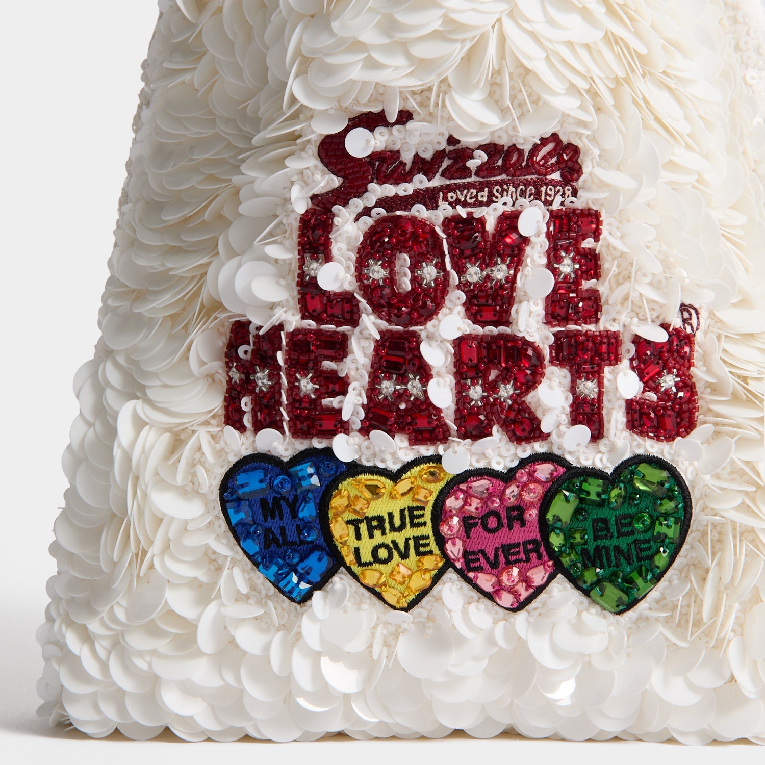 Made from recycled satin and intricately embroidered and embellished with sequins and beads, our Love Hearts Mini Tote is an ode to the iconic British confectionery. Fill it with your going-out essentials and tote it by the top handles to a wedding or dinner date.