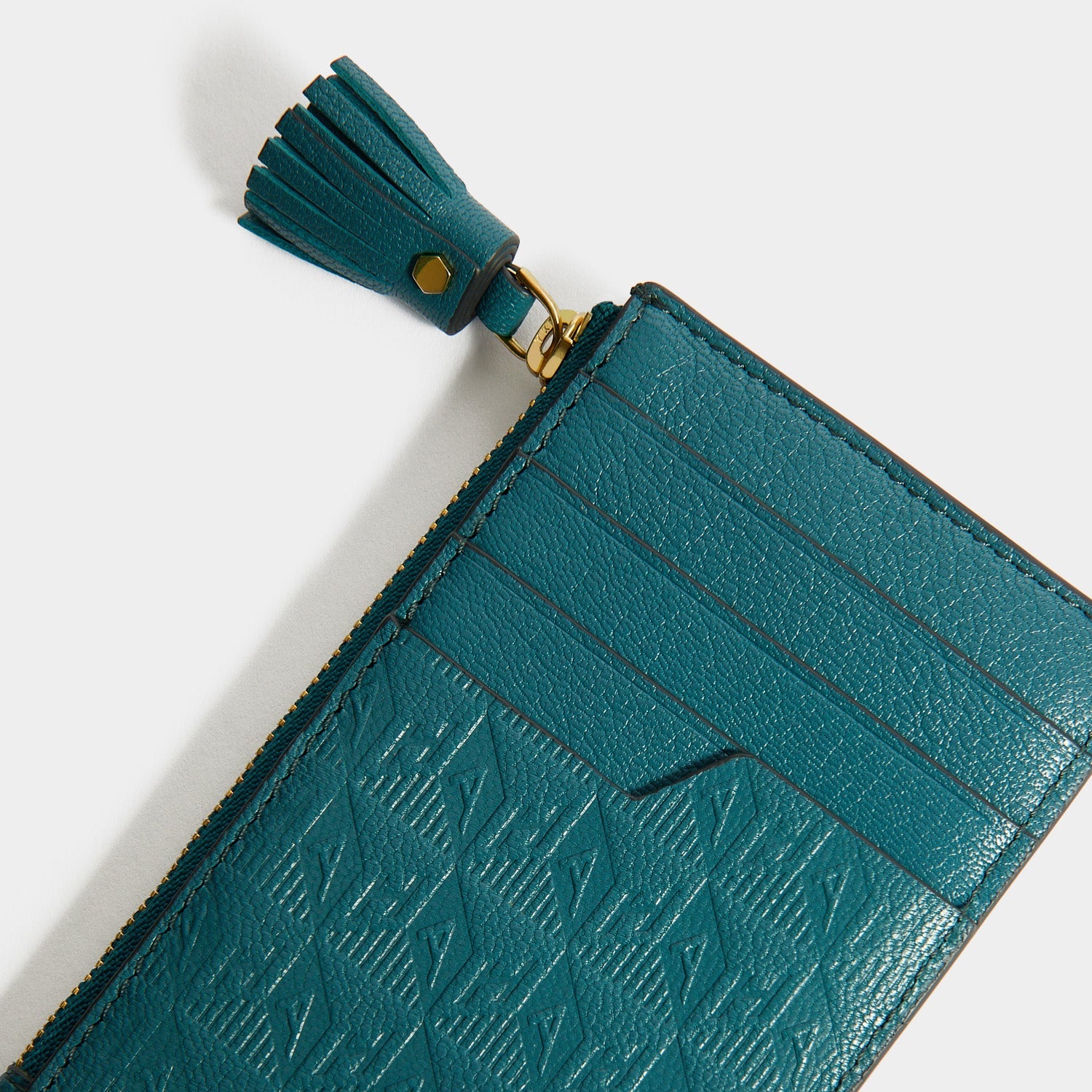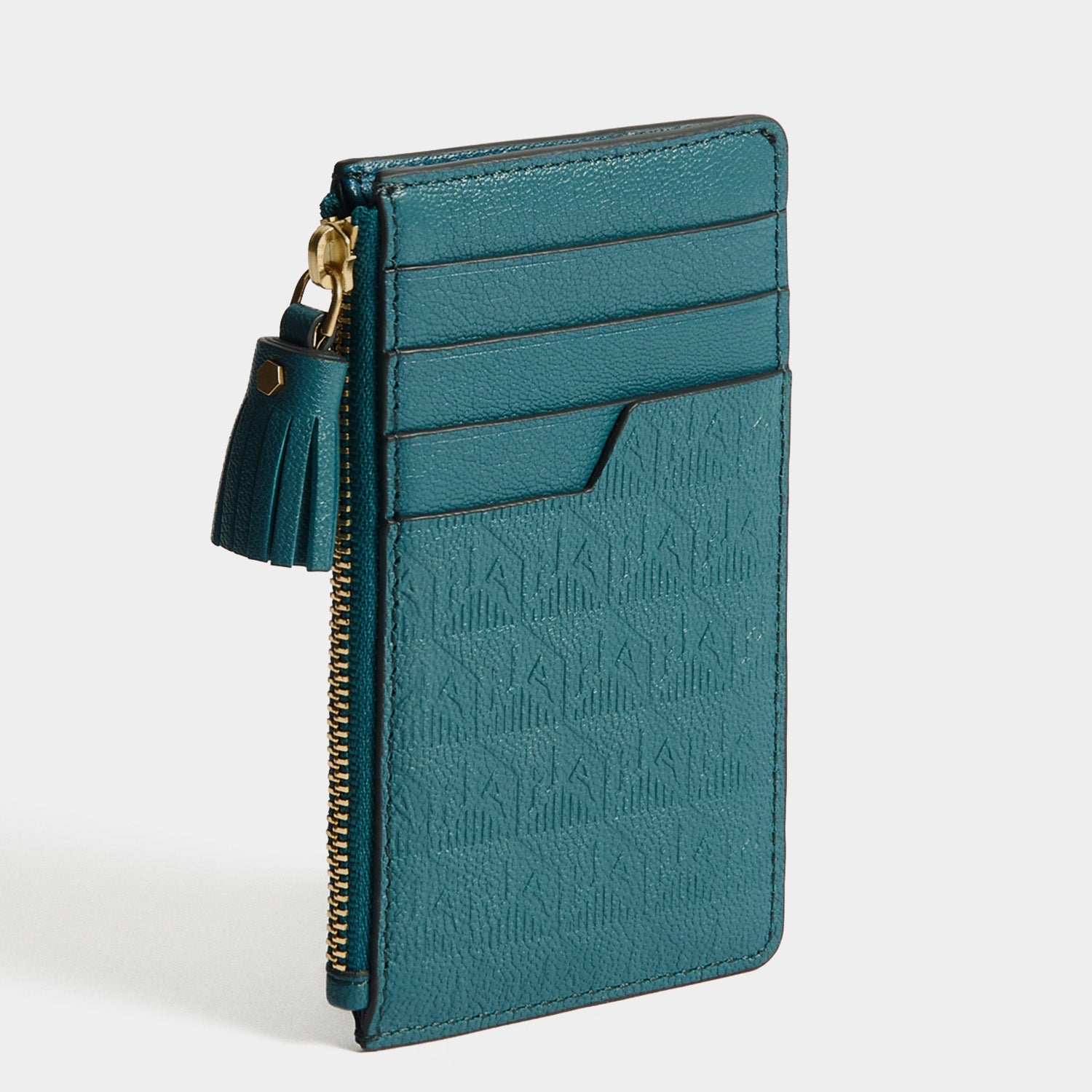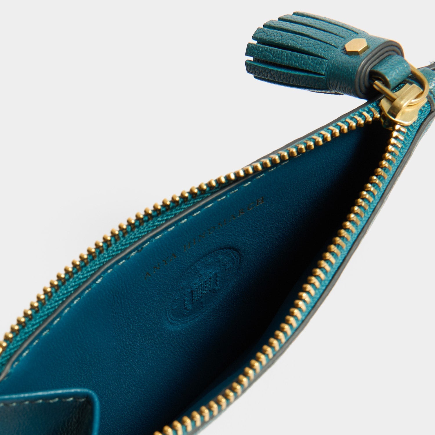 External features: Tassel zip pull, Anya Hindmarch print, slots for cards, Anya Hindmarch logo and bow