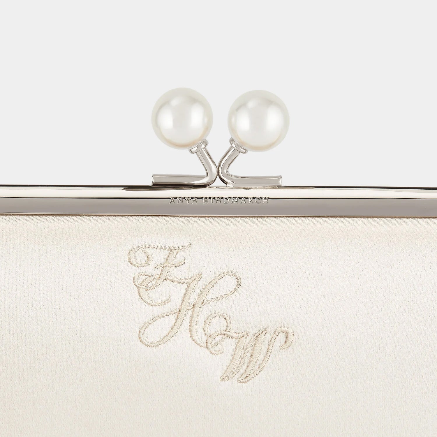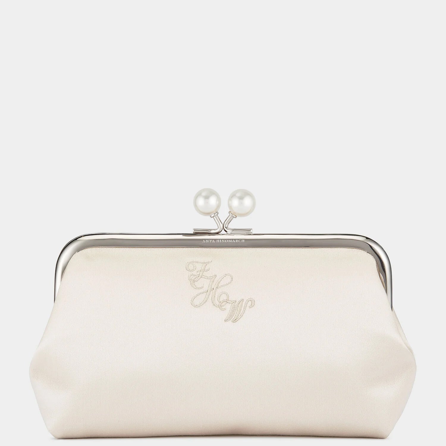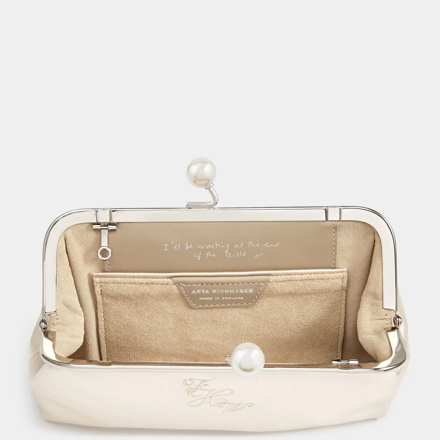 Our much-loved Maud bag is reimagined in ivory satin with a pearl-adorned clasp – perfect for a wedding. Personalisation options include adding embroidered initials, choosing a gold or silver frame, and either a Karma Sutra lining or suede, with an internal embossed message. Spacious enough to hold a phone, wallet and makeup essentials, the long chain strap can be detached or tucked inside to transform it from a shoulder bag into a clutch.