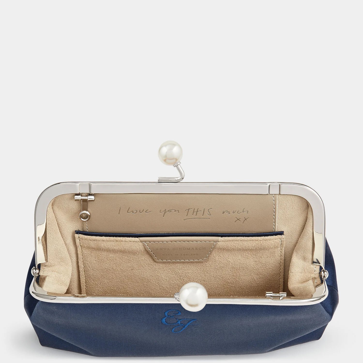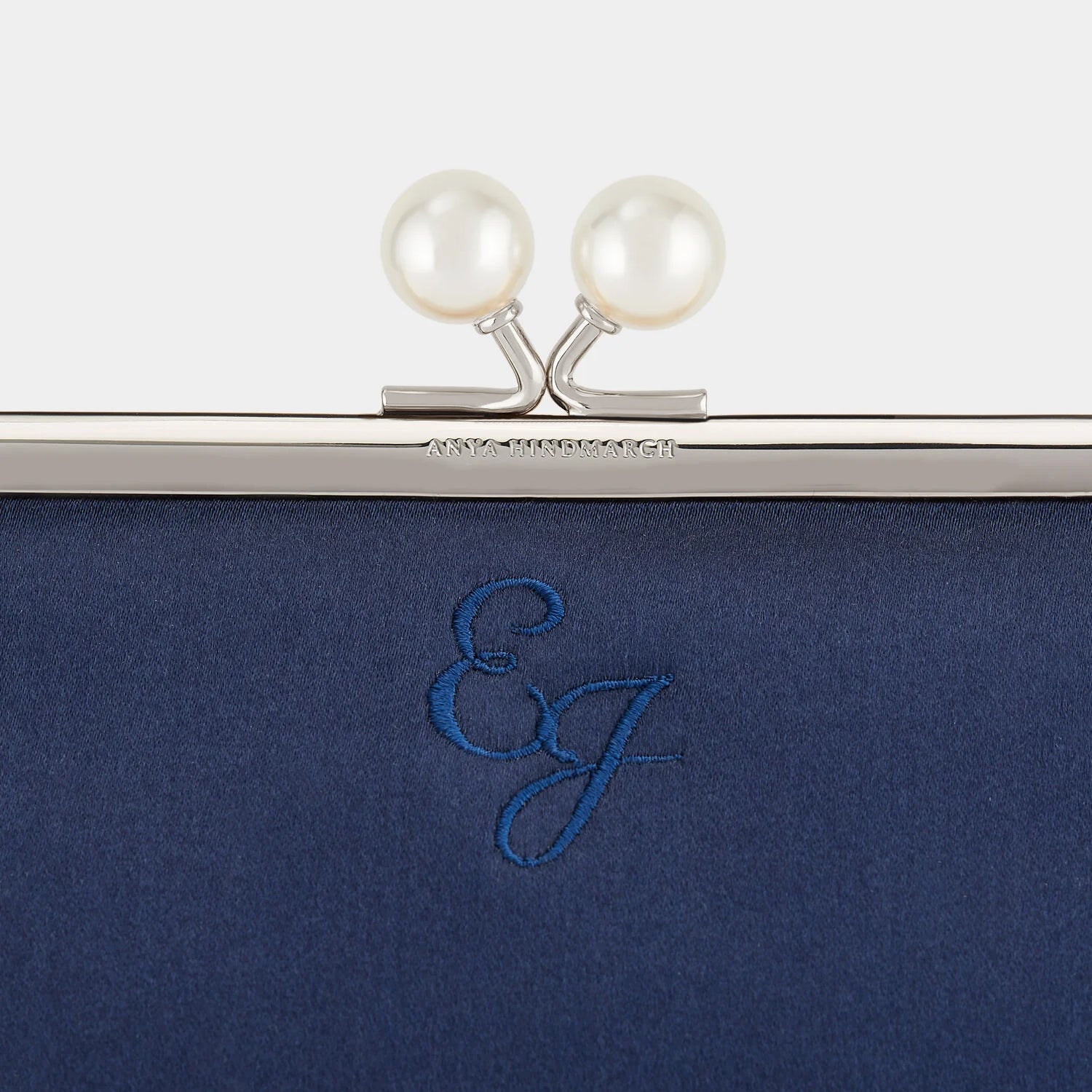 Our much-loved Maud bag is reimagined in ivory satin with a pearl-adorned clasp – perfect for a wedding. Personalisation options include adding embroidered initials, choosing a gold or silver frame, and either a Karma Sutra lining or suede, with an internal embossed message. Spacious enough to hold a phone, wallet and makeup essentials, the long chain strap can be detached or tucked inside to transform it from a shoulder bag into a clutch.