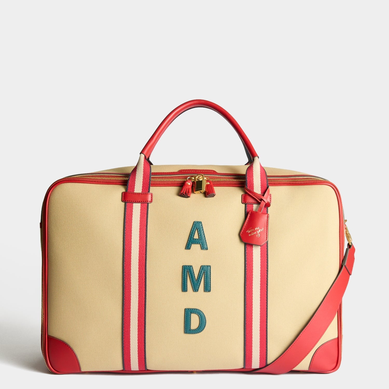 Travelling is chicer with a bespoke weekend bag. That’s where the Walton Latimer comes in; crafted from lightweight canvas and trimmed in leather, it can be personalised with your monogram. There is also the option to emboss a full name on the leather tab, and a handwritten message or initials on the key cover. We’ve added a whole host of quintessentially Anya details: the zip is adorned with two leather tassels and a golden lock, while the interior zipped pocket features our embossed logo and gold bow. Carry it by the top handles or the long, adjustable strap.