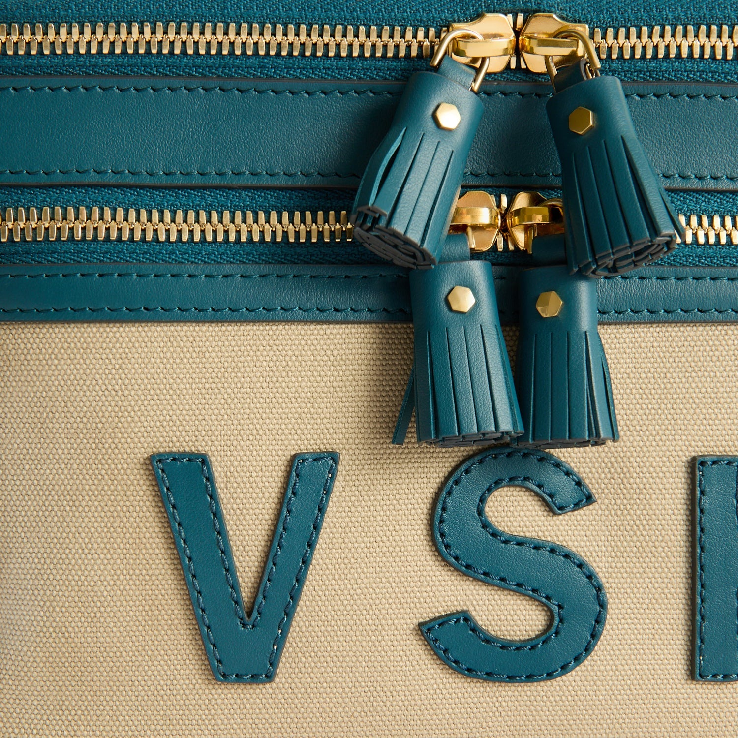 External features: Applique leather initials and a gold-embossed name, gold-tone zip with tassel zip pull