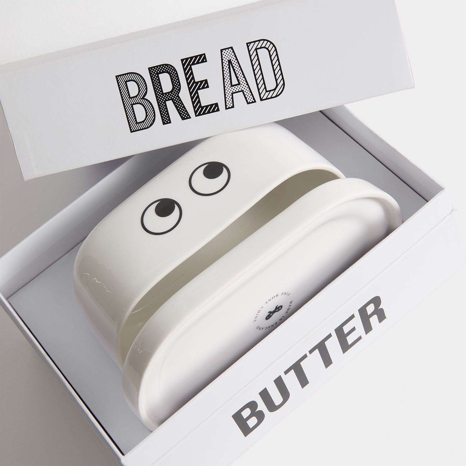 External features: Eyes motif decoration and labelled with 'ANYA HINDMARCH' at the back of dish, made-to-keep box labelled with 'BREAD BUTTER' at the front and 'SPREAD BITE' at the back