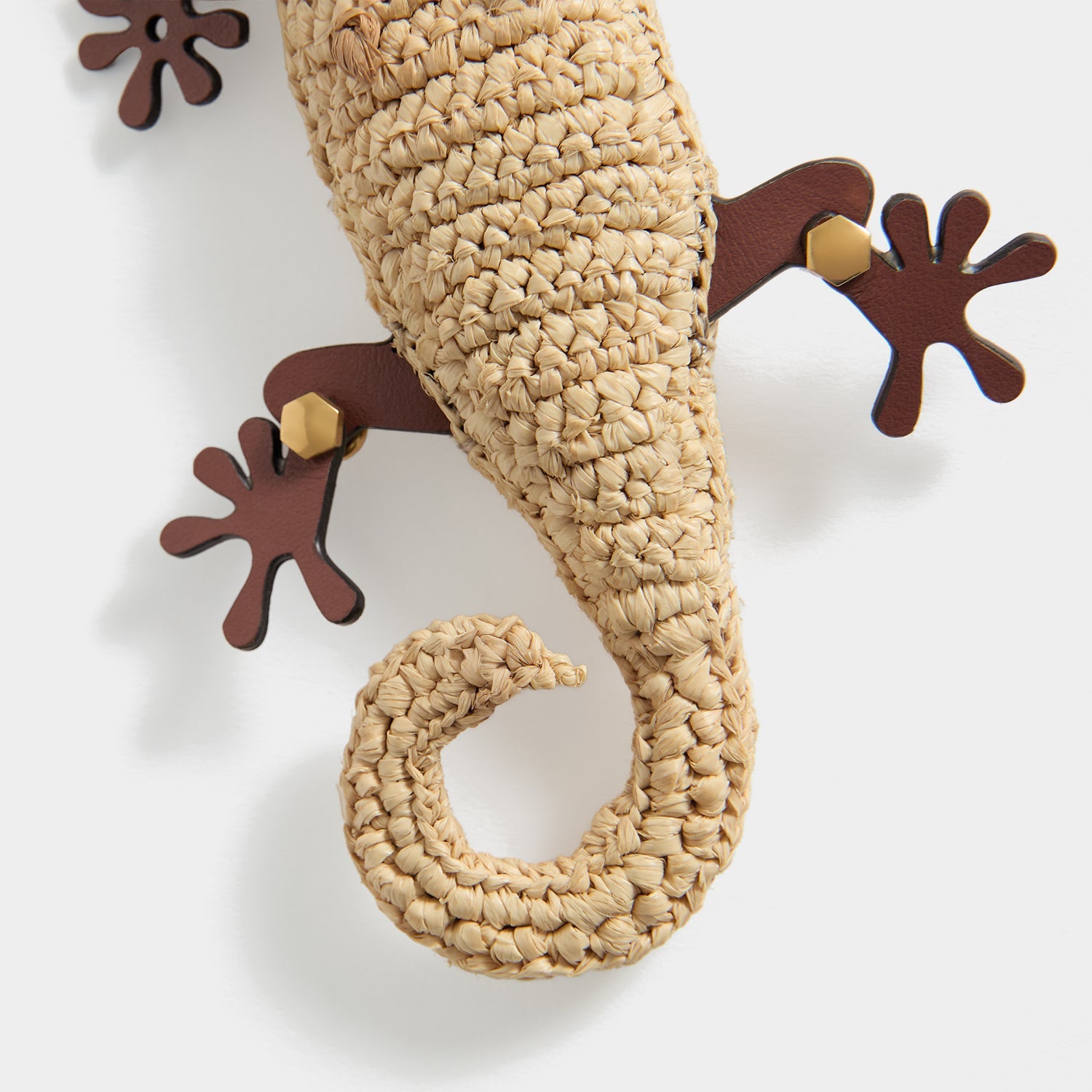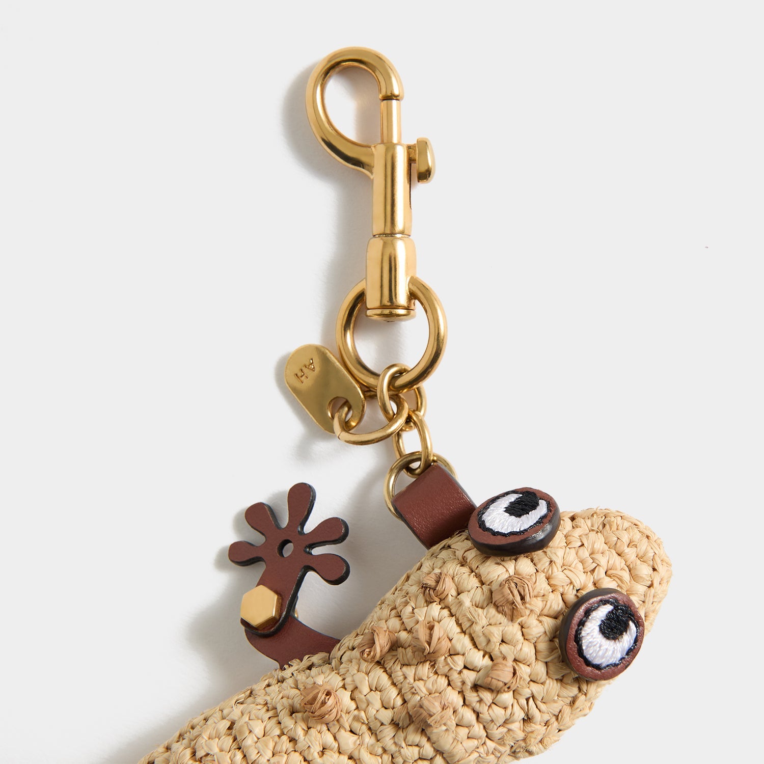 Personalise your summer bag with the Gecko charm. It is woven from natural raffia and finished with embroidered leather eyes and articulated legs, as well as a gold-tone clasp for clipping onto your favourite tote or basket bag.