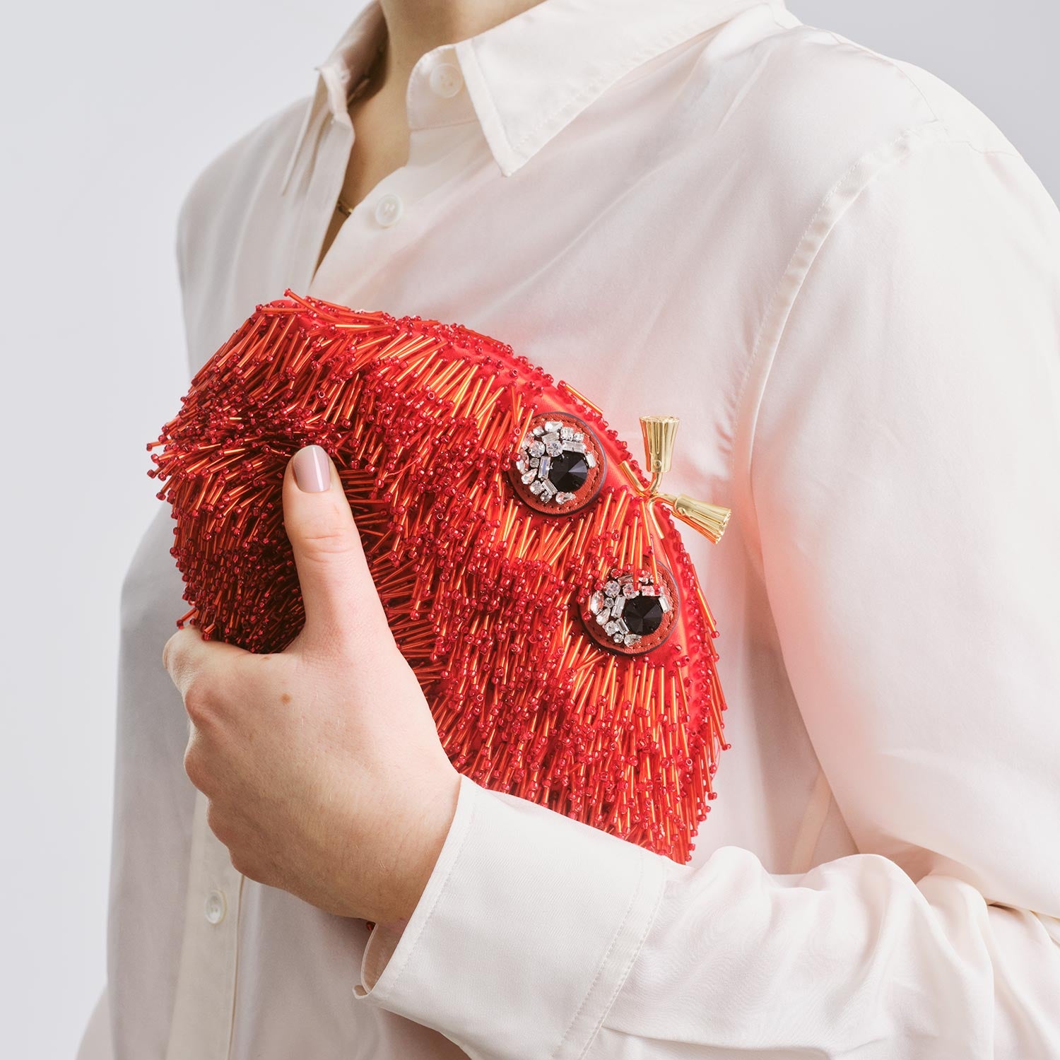 Shaggy bead embellishments and a pair of crystal-encrusted eyes give this evening bag its unique character. The Crab Cross-Body opens via a pair of gold-tone tassels to reveal space for party essentials, and can be slung cross-body via the optional chain strap. Inside, there is a metallic label, detailed with our logo and a tiny golden bow.