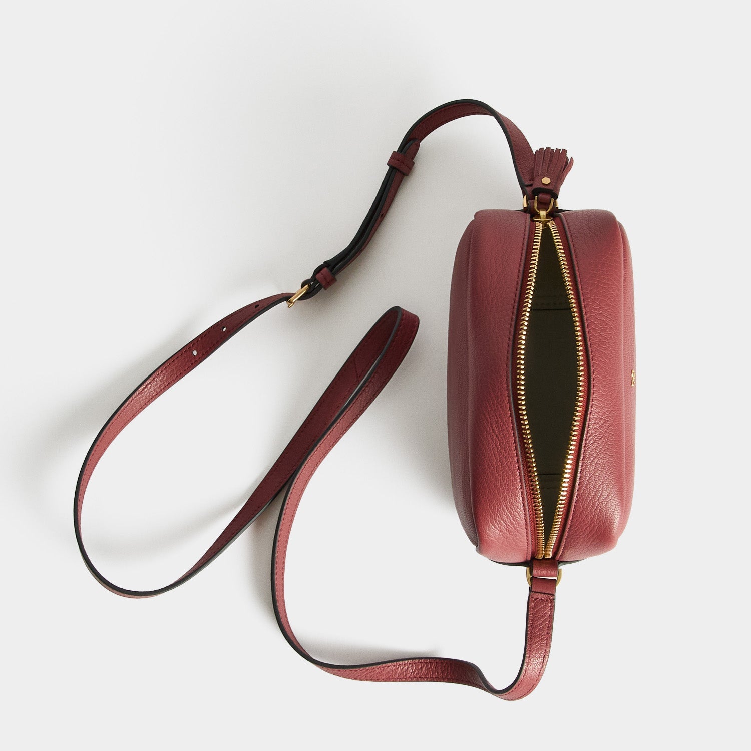 External features: Zip closure with tassel, adjustable strap