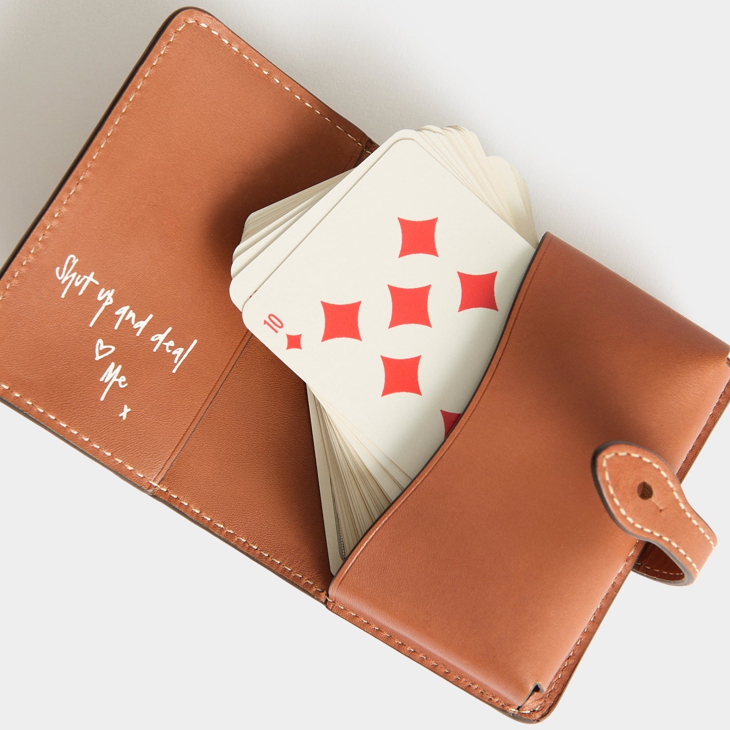 Our Deck of Cards Holder makes a fine gift for the keen bridge player. Crafted from tan butter leather, the case can be embossed inside and out with a name, set of initials, or message – in our signature type or your own handwriting. It opens via an AH-monogrammed button to a set of gilt-edged playing cards, featuring specially-chosen quotes.