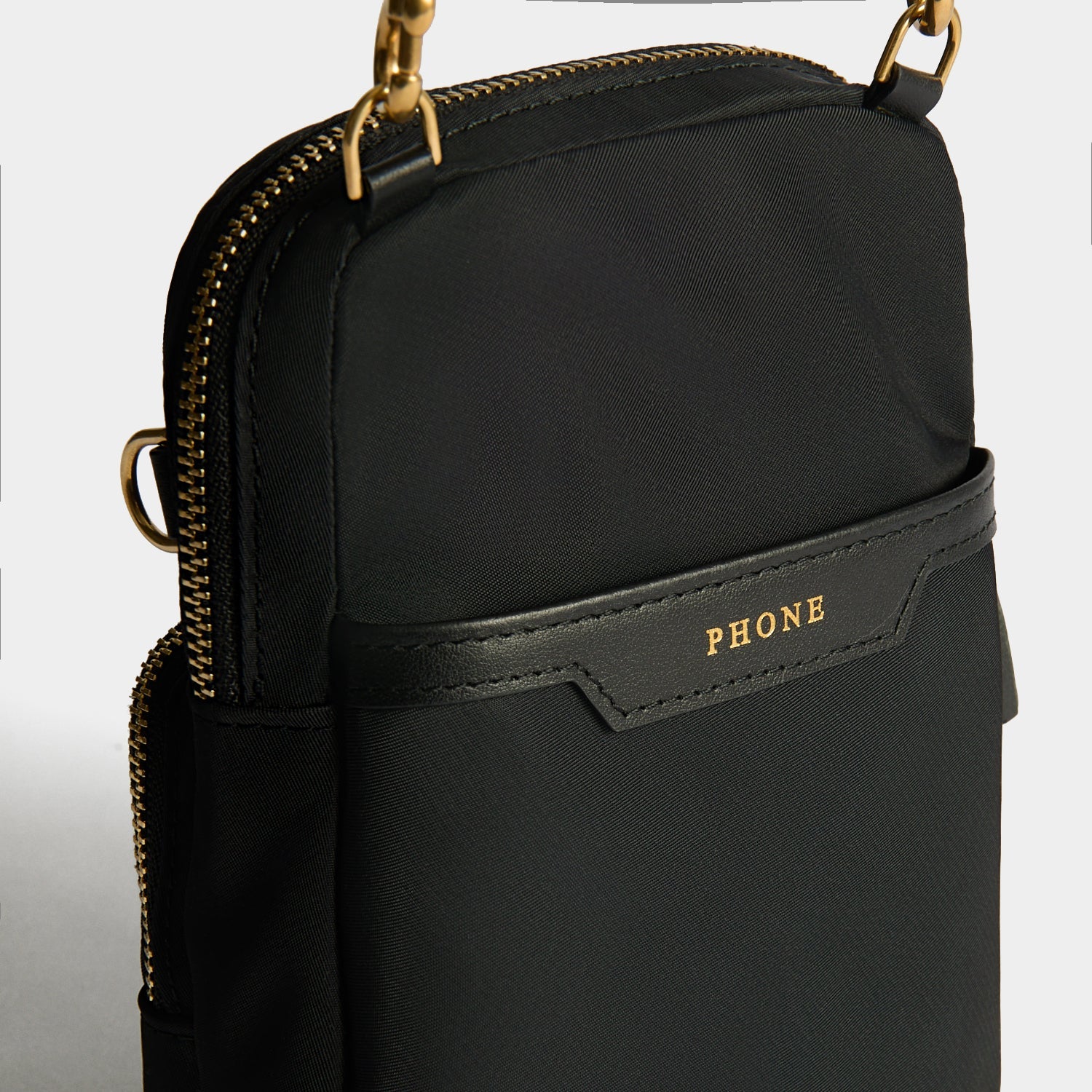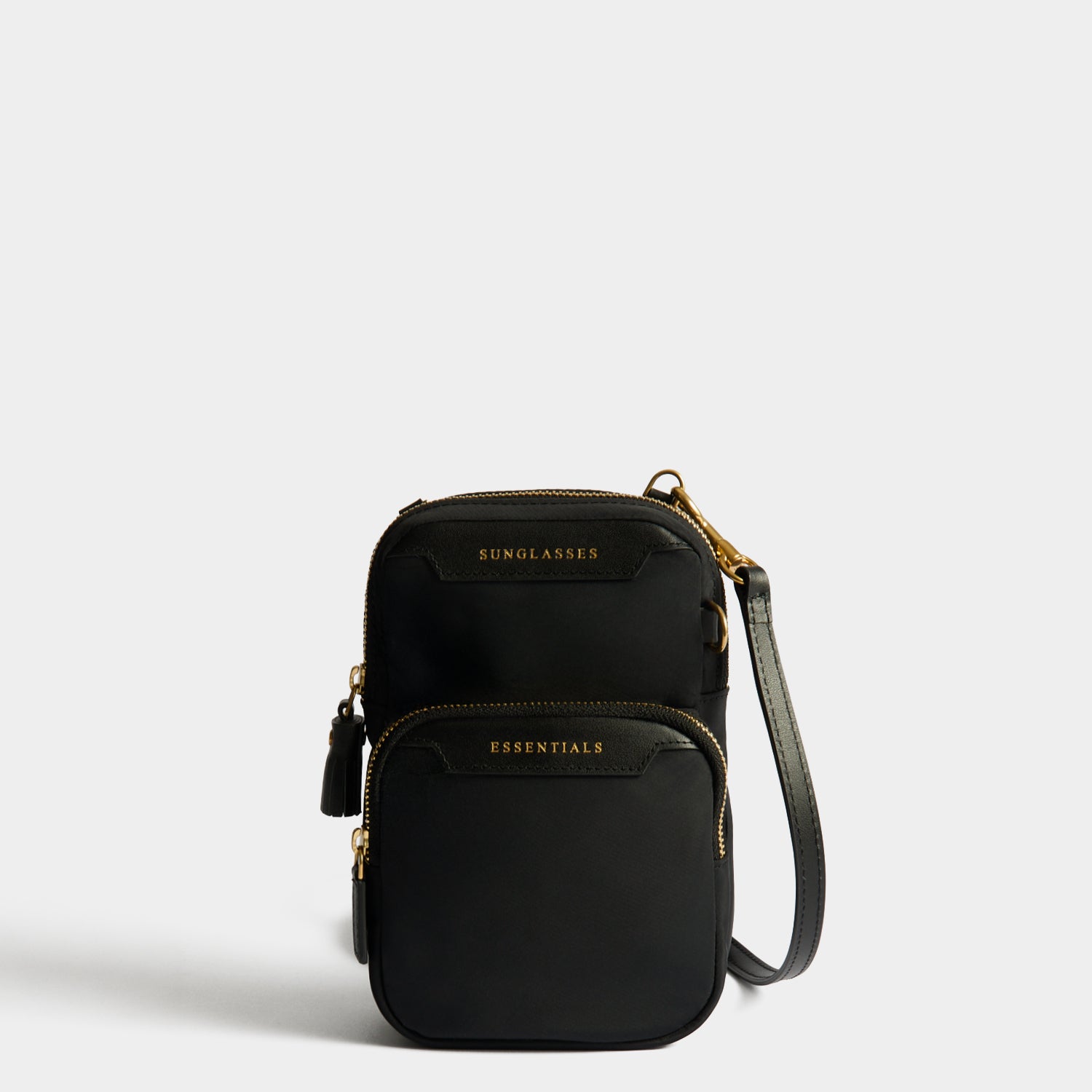 External features: Tassel zip pull, leather zip pull, D ring, front pocket labelled 'ESSENTIALS', main pocket labelled 'SUNGLASSES', back pocket labelled 'PHONE', adjustable leather cross-body strap