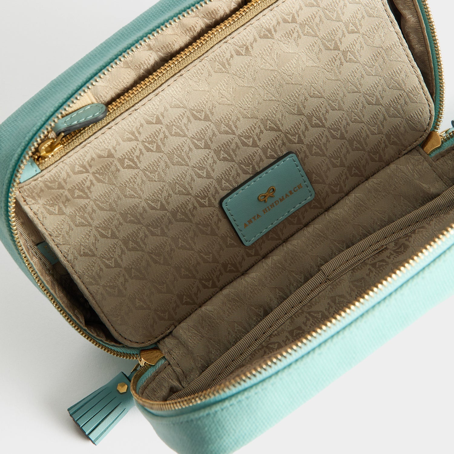 External features: Tassled double zip, gold-tone hardware, gold Anya Hindmarch bow, leather sawn-on letters