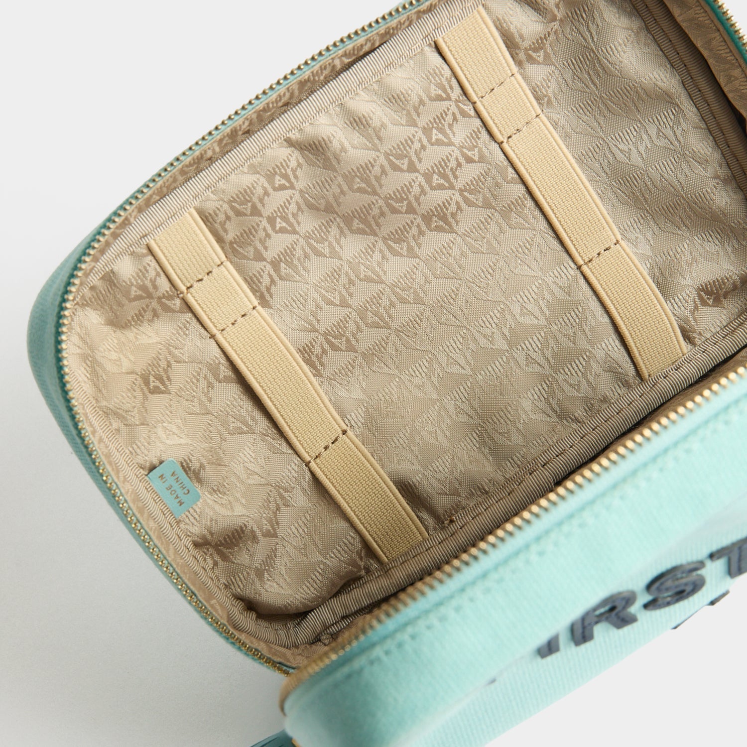 Internal features: Zipped pocket, monogrammed lining, leather logo patch, elastic fastenings