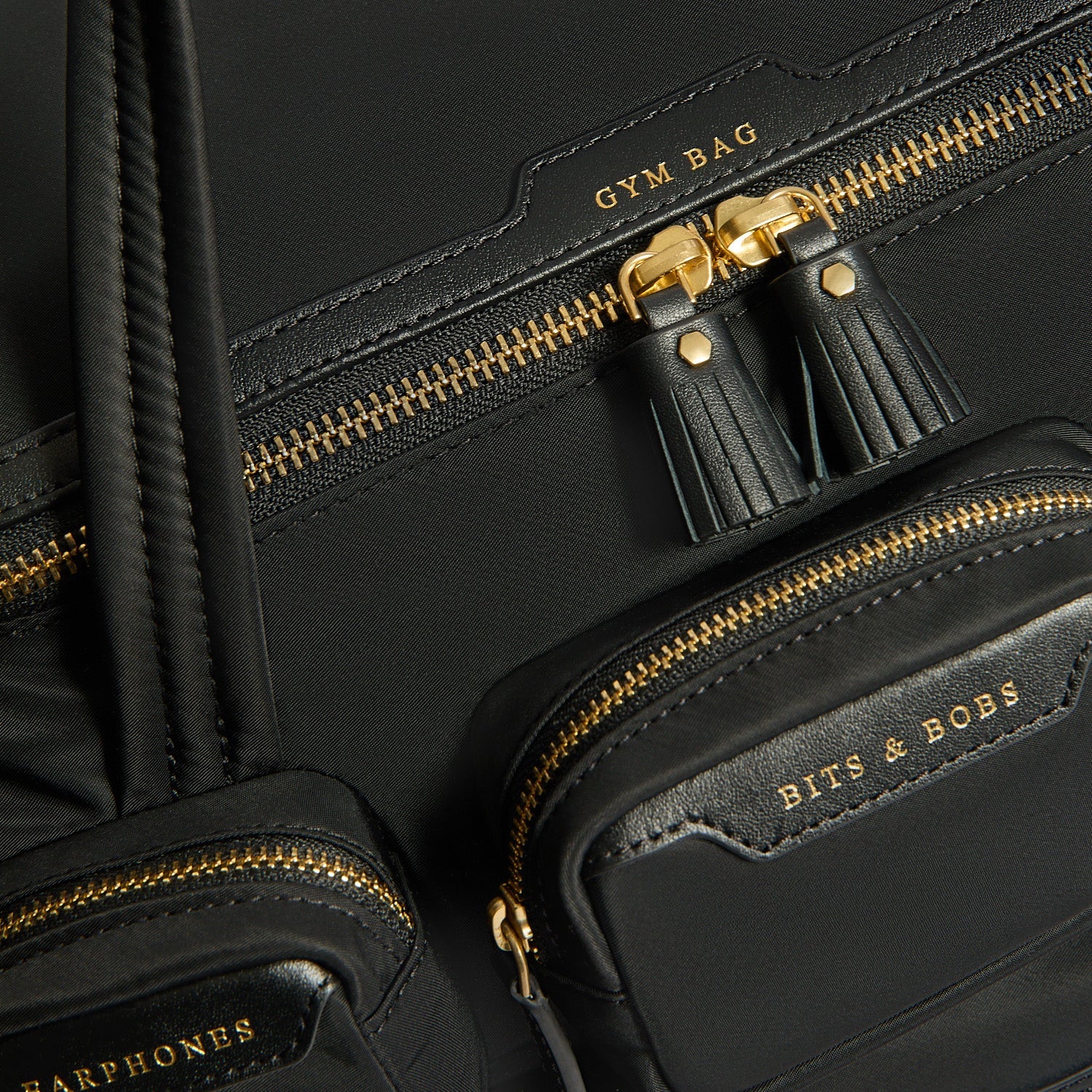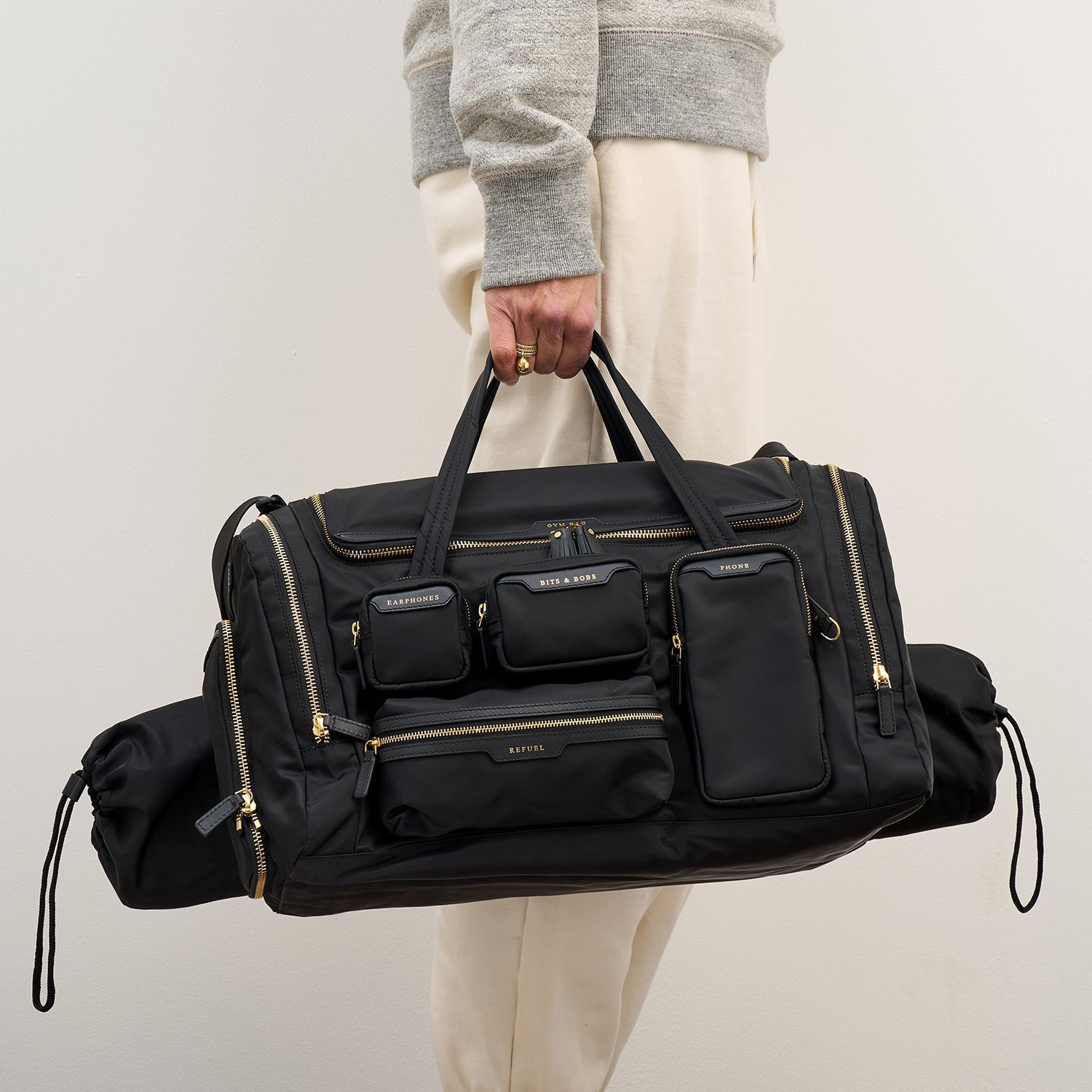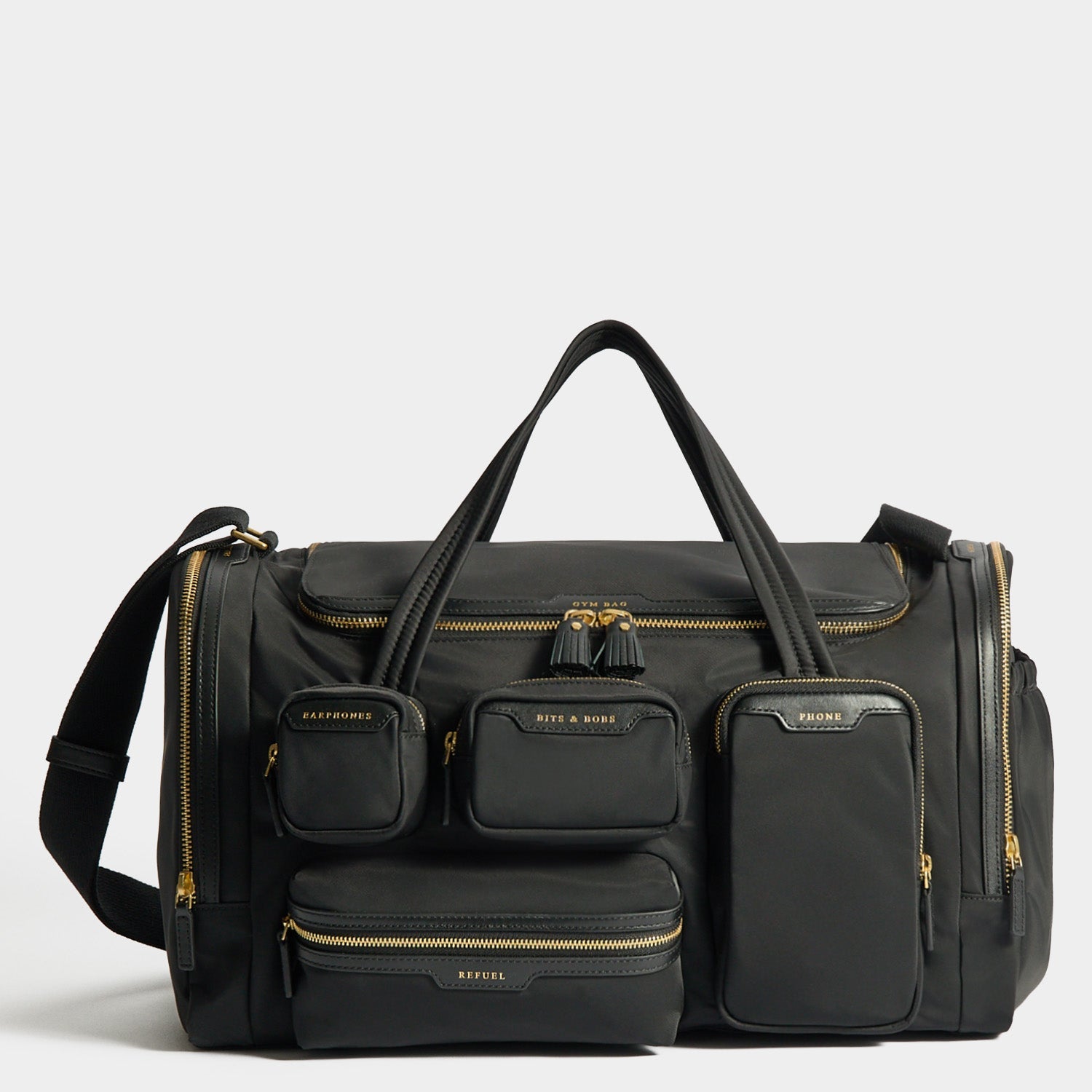 External features: Top handles, gold-tone hardware, Pockets labelled BITS & BOBS, EARPHONES, REFUEL and PHONE, side pockets labelled LOTIONS & POTIONS, WATER and SHOES, back pocket labelled FLOOR MAT, with pull out drawsting fastening