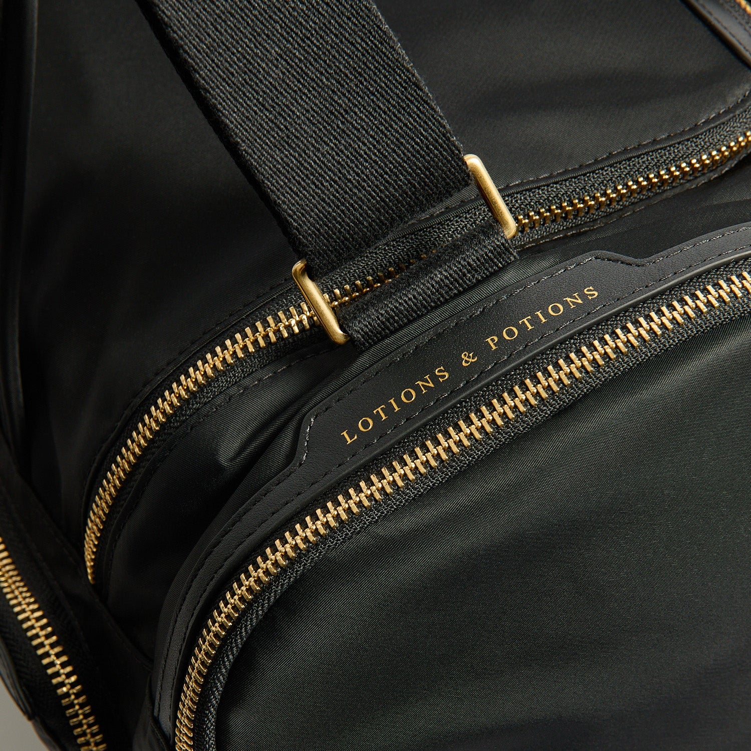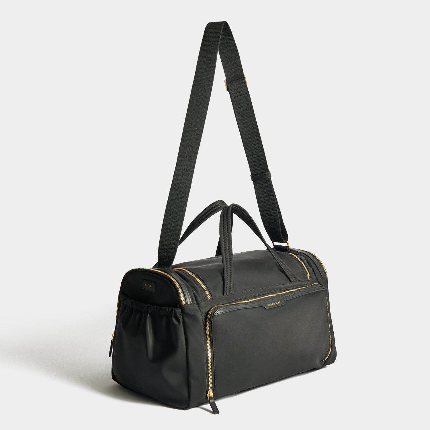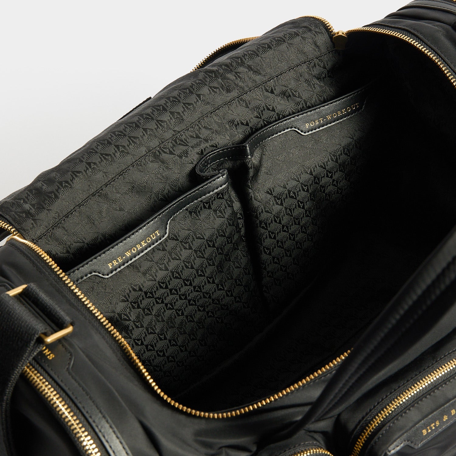 External features: Top handles, gold-tone hardware, Pockets labelled BITS & BOBS, EARPHONES, REFUEL and PHONE, side pockets labelled LOTIONS & POTIONS, WATER and SHOES, back pocket labelled FLOOR MAT, with pull out drawsting fastening