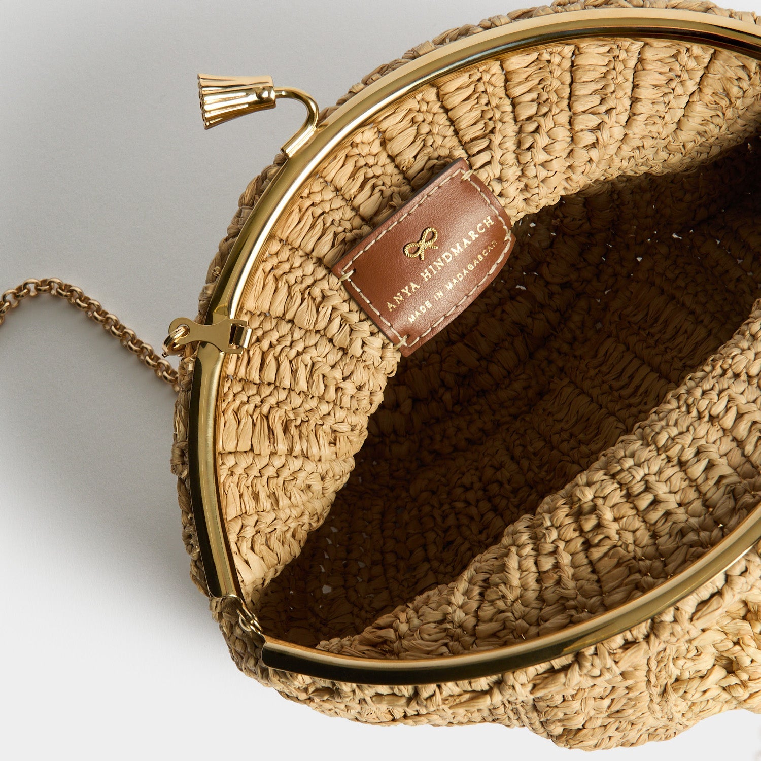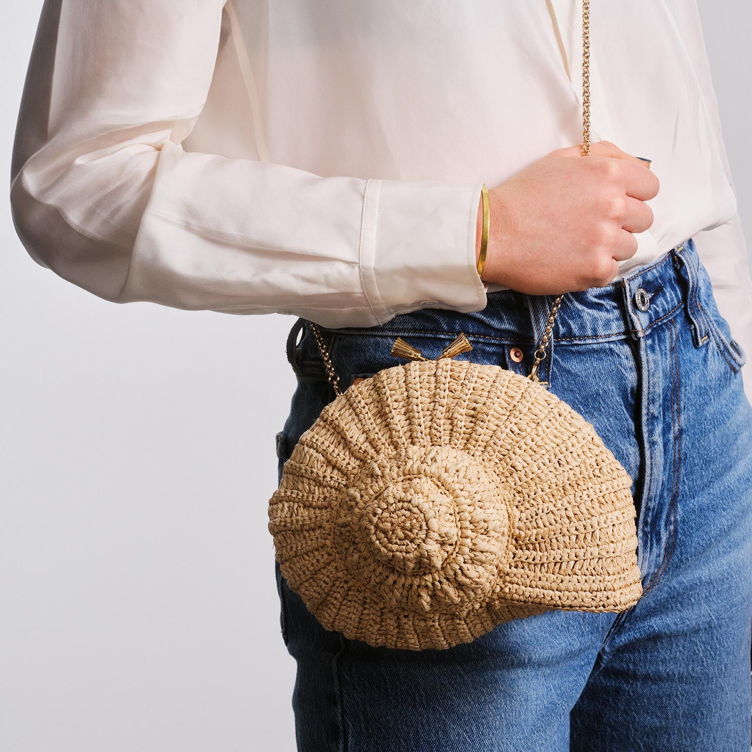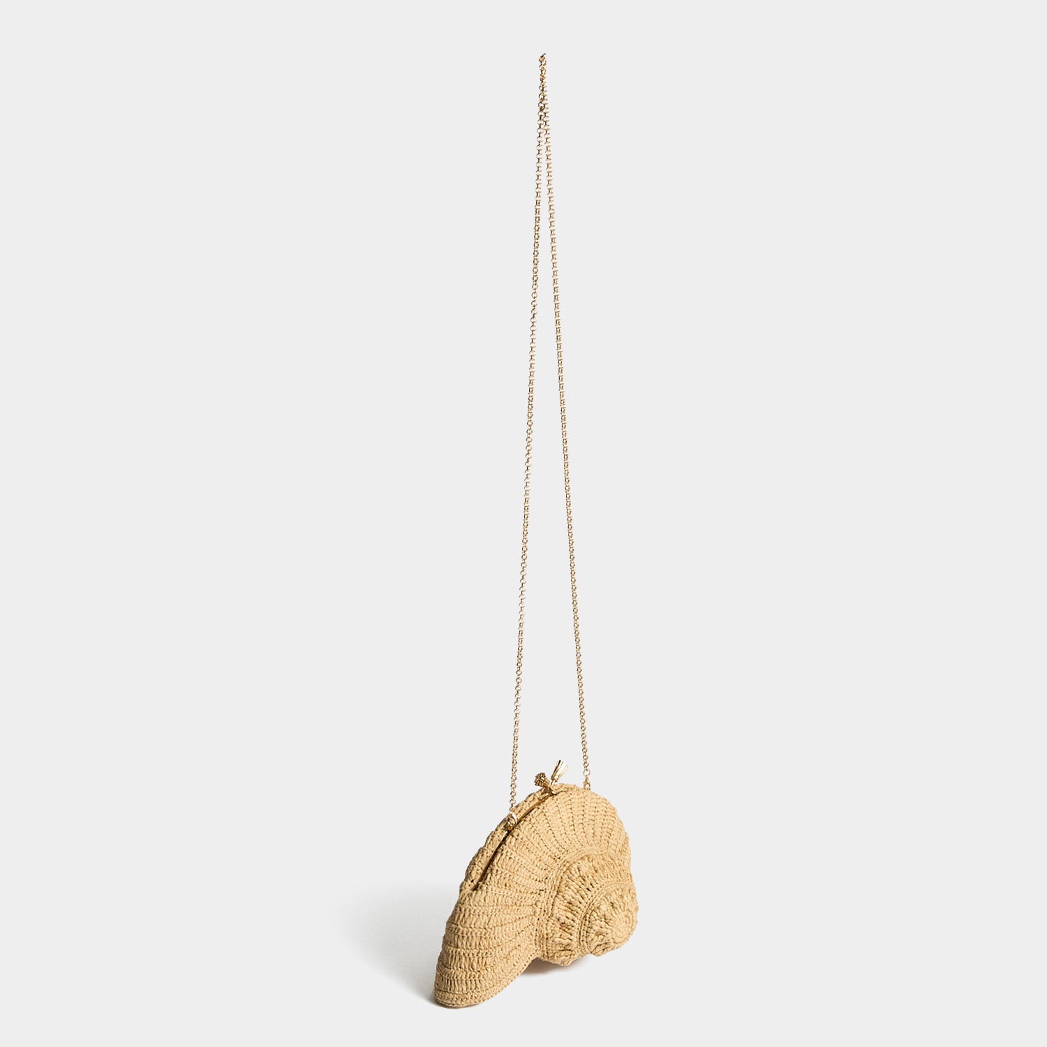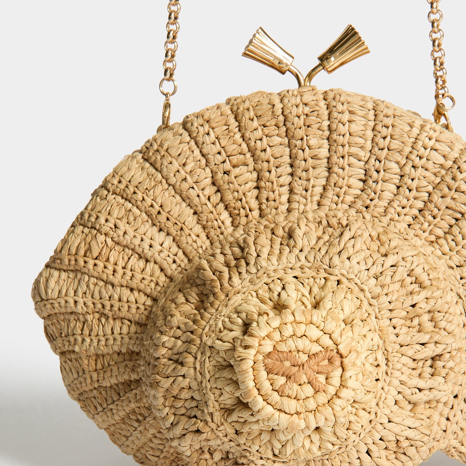 Handwoven from natural raffia in the shape of a nautilus shell, the Maud bag is perfect for holidays by the sea. It comes fitted with our golden tasselled clasp and a long strap for crossbody styling. The interior is unlined, for lightness, and finished with a leather logo patch, complete with tiny golden bow.