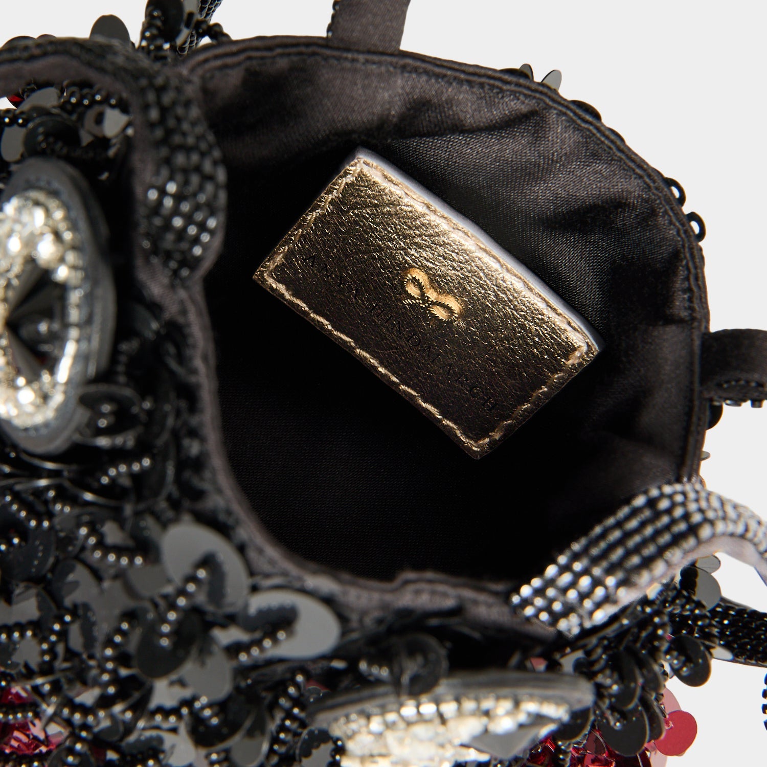- SPECIFICATION & MATERIALS- Dimensions: H17cm W15cm D4cm - Materials: Satin Leather, Sequins - External features: Bejewelled eyes and beaded strap - Internal features: Leather tab with Anya Hindmarch logo and bow Item number: 5050925201193