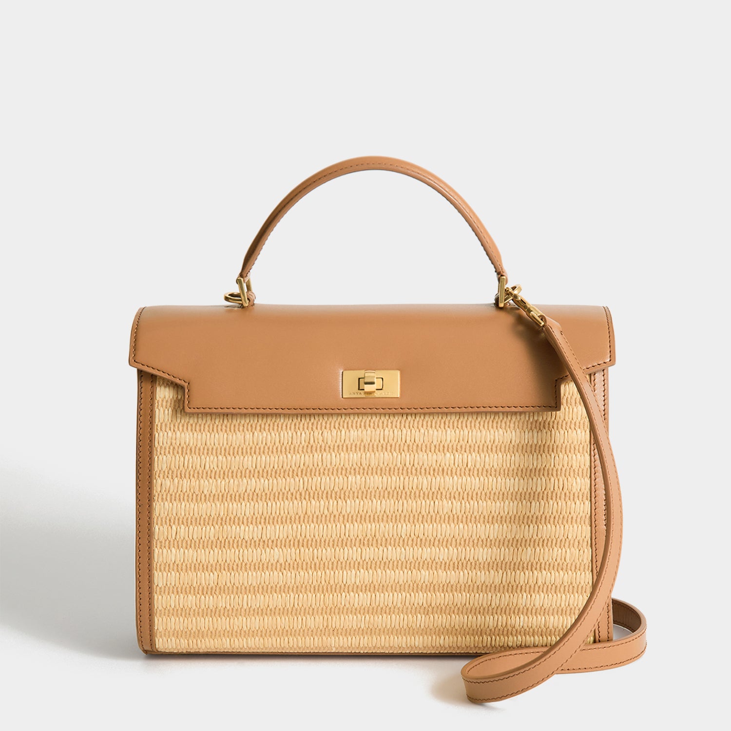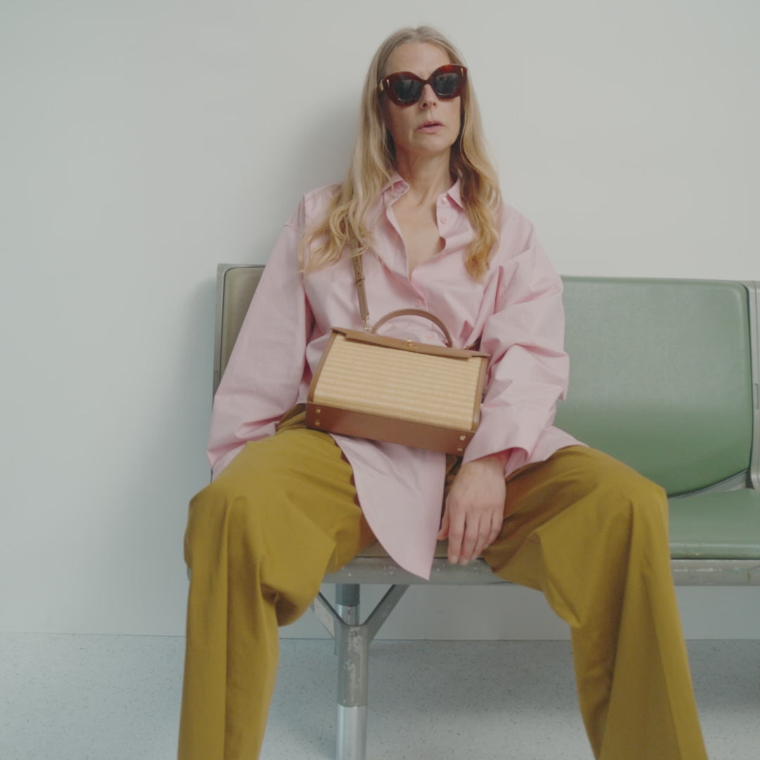 The Mortimer bag is beautifully crafted, with all of the organisation we are known for. Here, it is re-imagined in finely woven raffia and pecan shiny box calf leather, which has been rated Gold by the Leather Working Group. Nicknamed the 'filing cabinet', it features several compartments – one zipped, another with a handmade gold 'lip', plus pockets for your phone, cards, earphones and pen. The bag expands and closes with a satisfying 'click' thanks to the integrated magnet, and secures via a bow and logo-embossed twist-lock. Carry it by the top handle or style it cross-body by the optional long strap, adding a few charms onto the D-ring or strap loop.