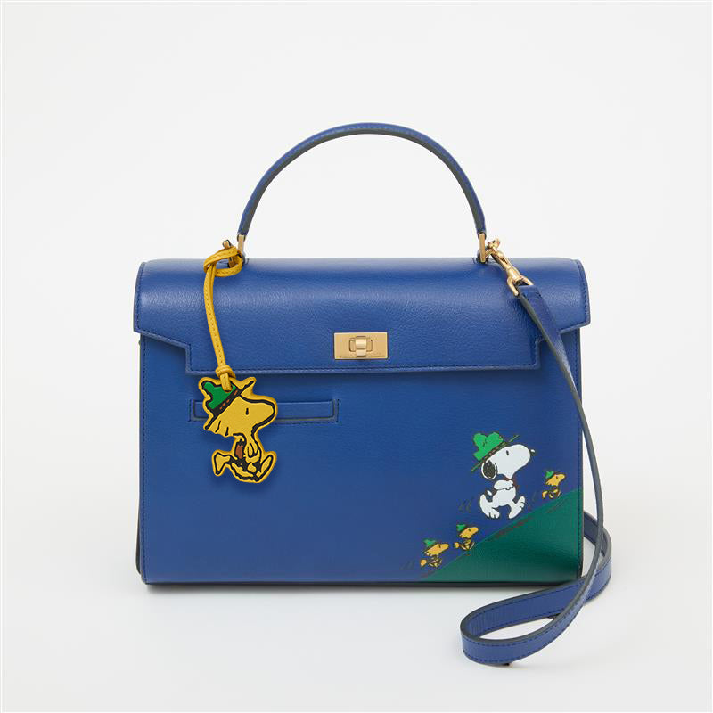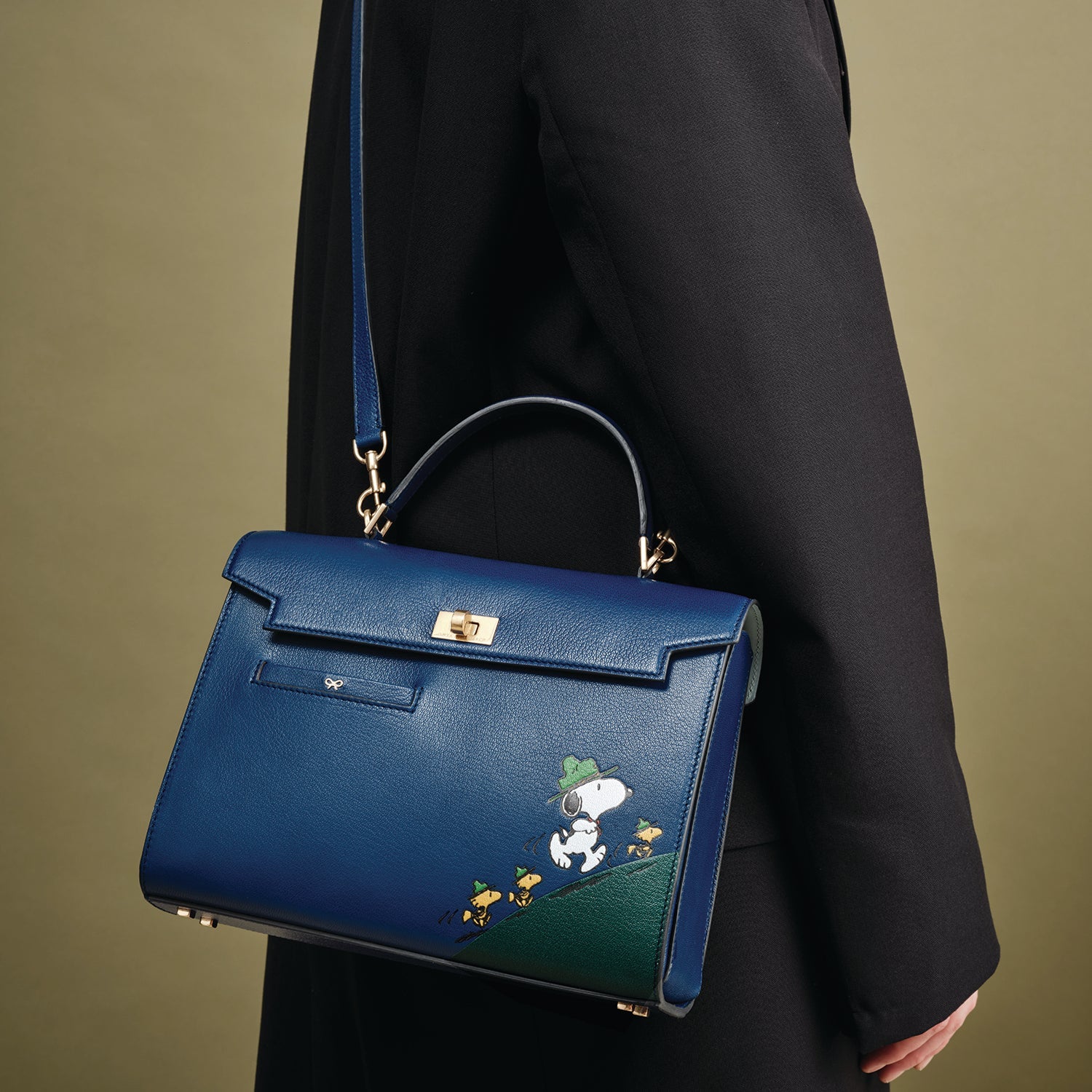 Handmade in Florence for the Peanuts x Anya Hindmarch capsule collection, this special-edition Mortimer bag is a collector’s piece. It is crafted from satin leather and printed with an outdoor scene featuring Snoopy, Woodstock and the other Beagle scouts. Carry it by the top handle or style it cross-body by the optional long strap.