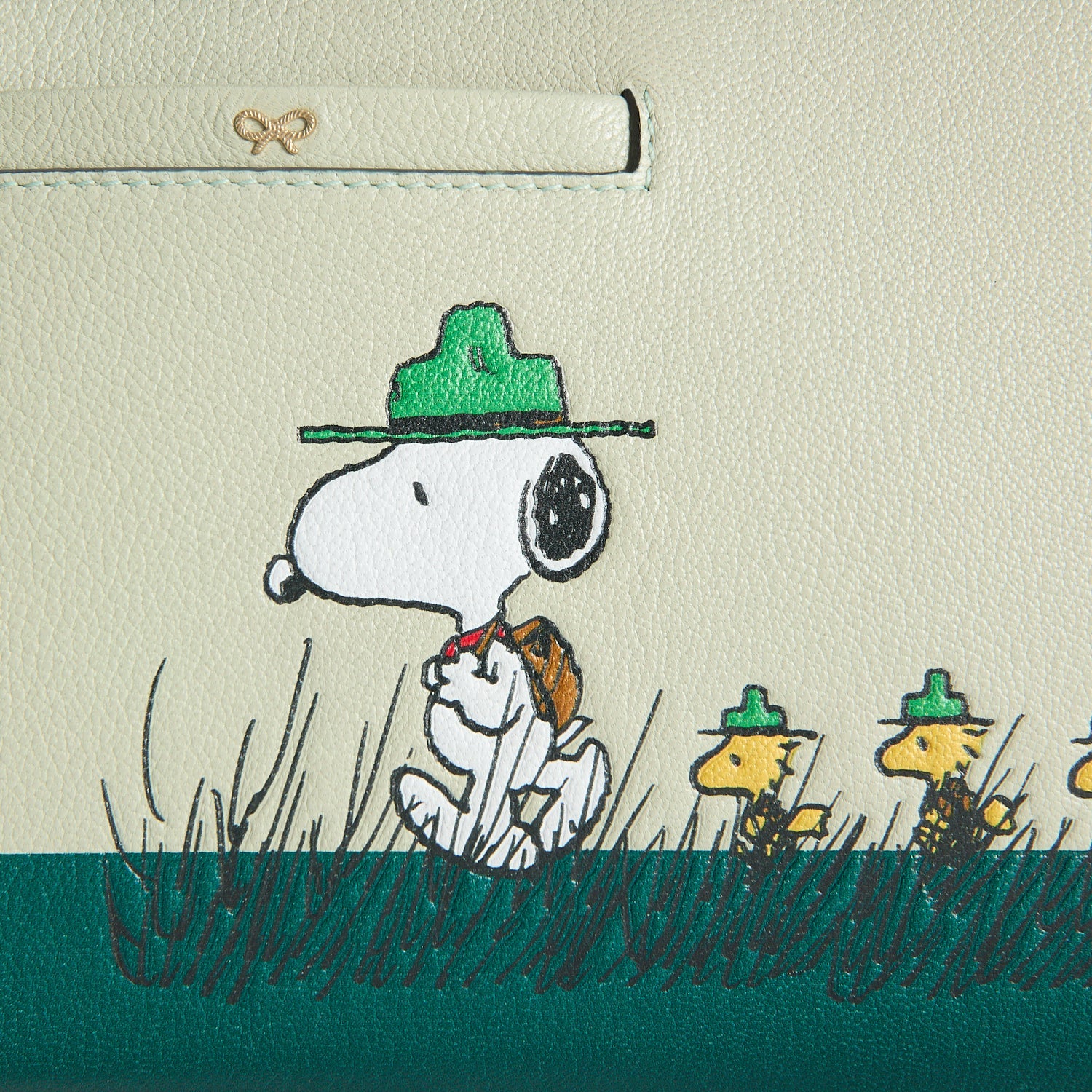 All the elegance of the Mortimer, with added character – this is a true collector’s piece. Part of our Peanuts x Anya Hindmarch capsule collection, this charming version of one of our most elegant bags is given extra personality with the addition of illustrations from Charles M Schulz of Snoopy, Woodstock and the rest of the Beagle Scouts troupe as they march across the smooth Eau de Nil calf leather, which is rated Gold by the Leather Working Group. This very special bag also comes accompanied by a cute removeable Woodstock leather charm.