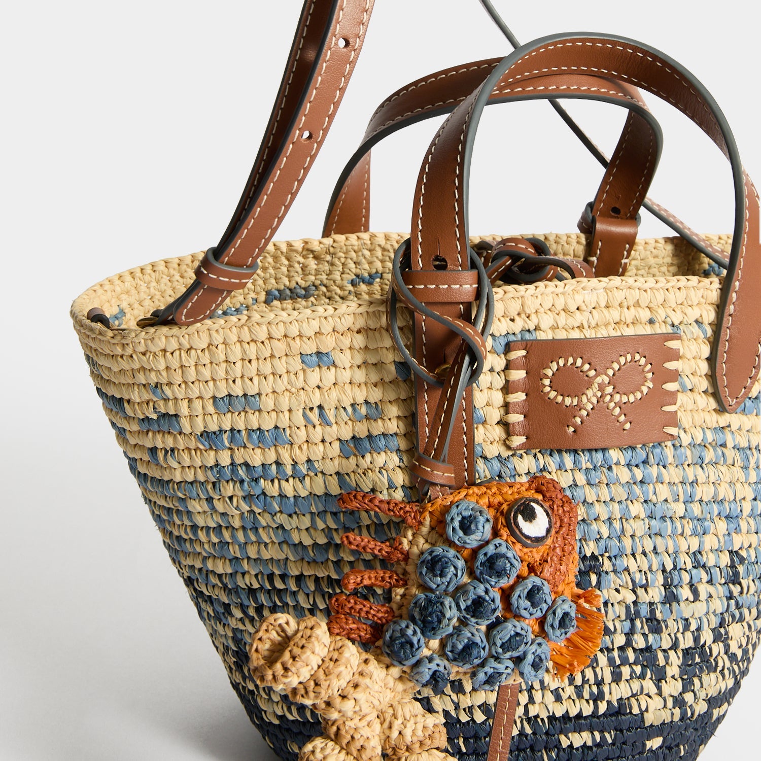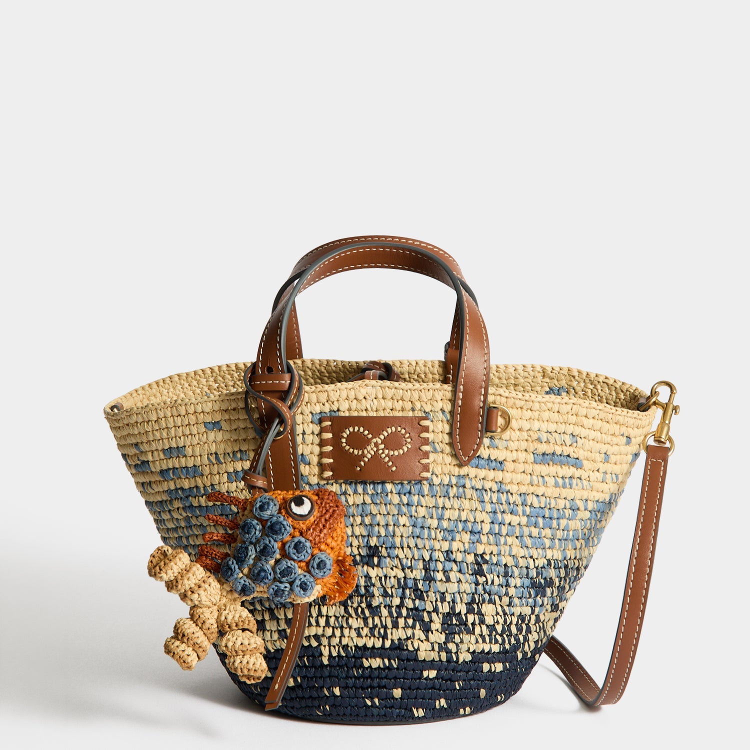 Perfectly sized for day trips and beachside evenings alike, this compact basket bag is a holiday must-have. It is handwoven from raffia in a dégradé design and fitted with adjustable leather top handles, a detachable long strap for hands-free styling and an intricately crafted fish charm. Use it to stow sunglasses, a card holder, and makeup essentials.