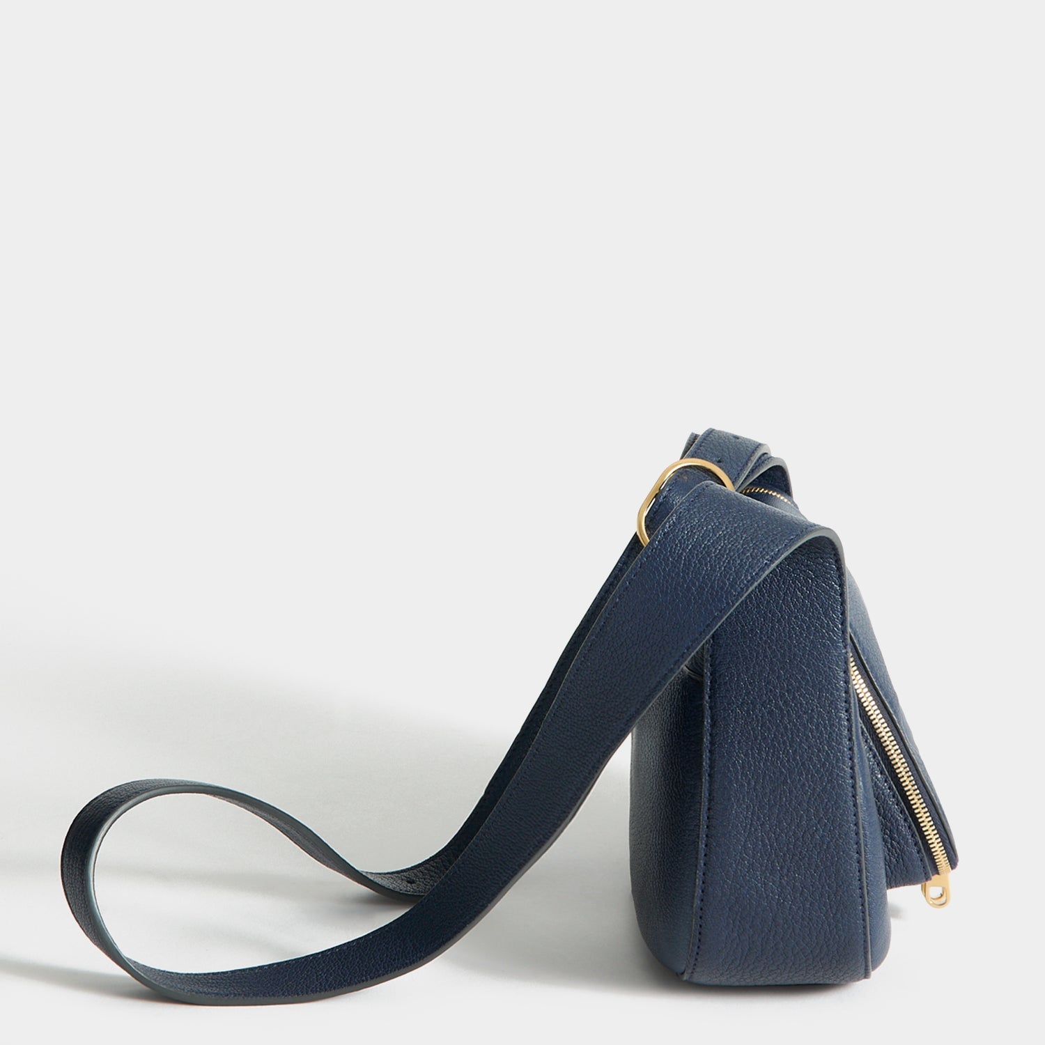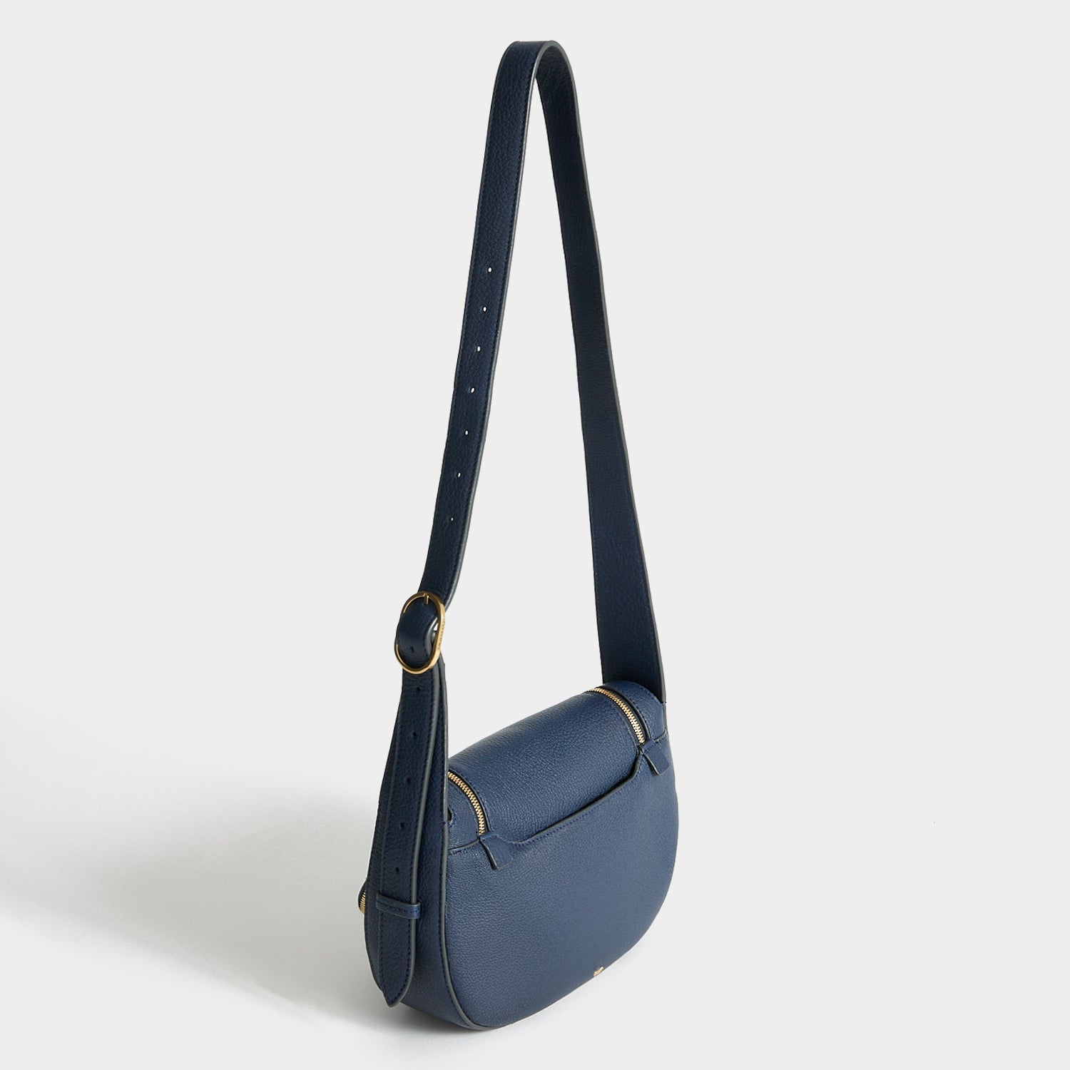 The Small Vere Cross-Body bag marries craftsmanship and organisation. It is crafted from navy shiny grain leather – which carries a Leather Working Group rating – and opens via a two-way zip, with a magnetic closure to keep belongings secure, even while unzipped. Inside the burgundy interior are labelled sections for your keys and receipts, as well as space for your daily must-haves. Adjust the strap to your ideal length, stowing the excess length into the keeper on the side.