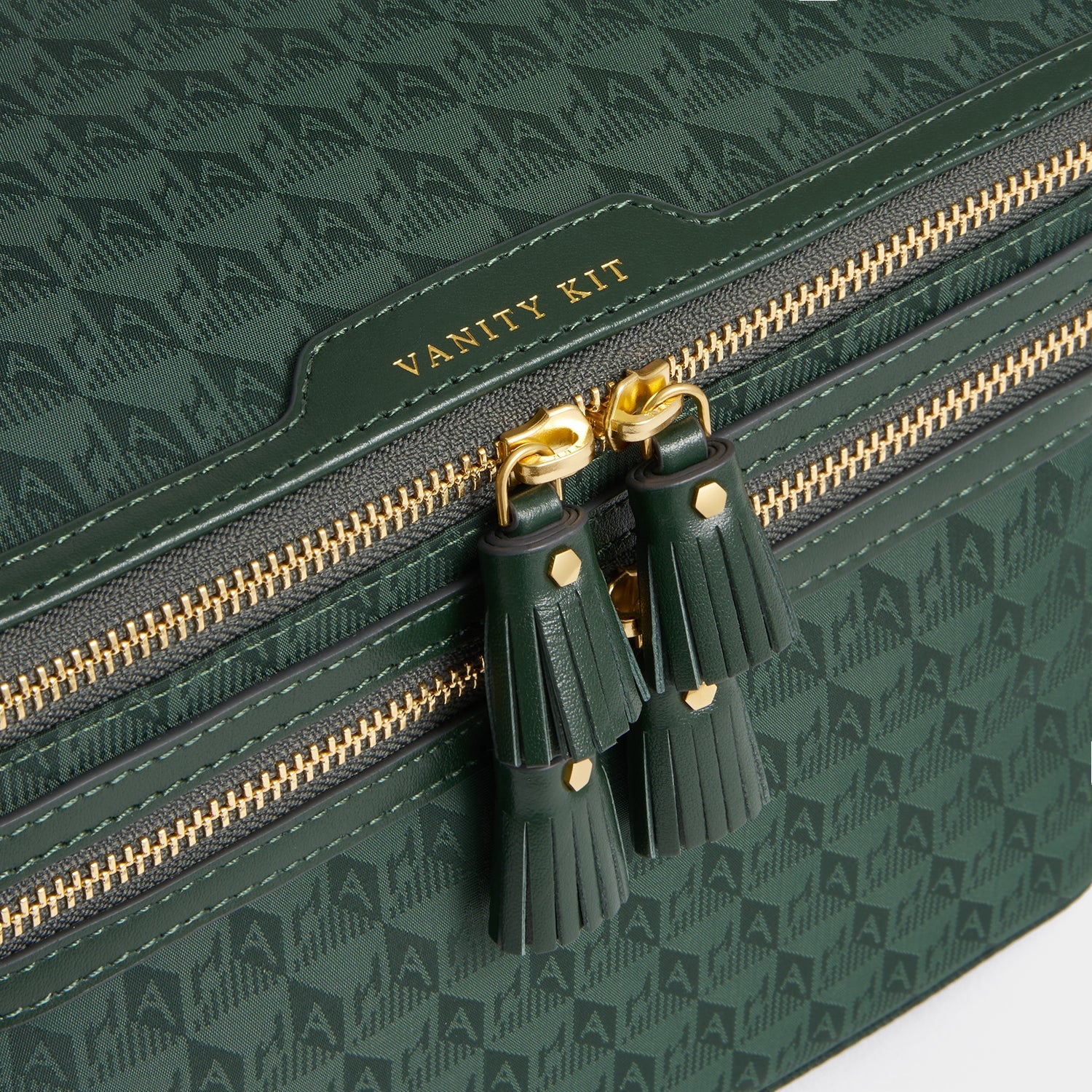 External features: Leather nameplate labelled with 'VANITY KIT' embossing, gold-tone zip with tassel zip pull, Anya Hindmarch bow, AH fabric embossing