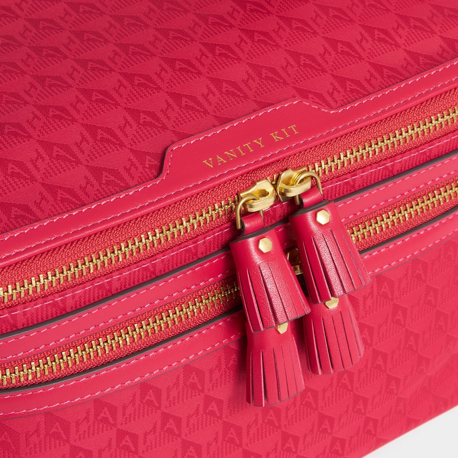 External features: Leather nameplate labelled with 'VANITY KIT' embossing, gold-tone zip with tassel zip pull, Anya Hindmarch bow, AH fabric embossing