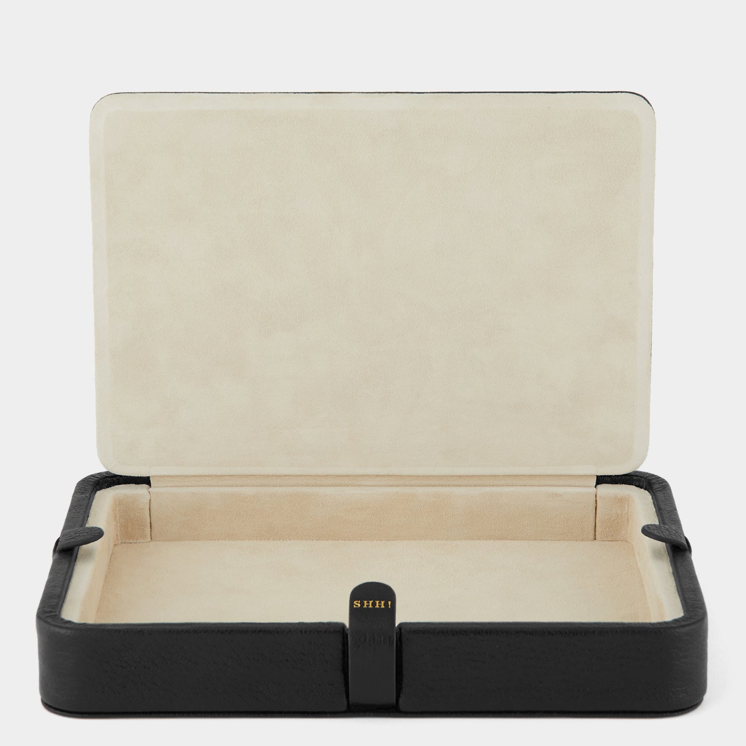 In capra leather, this finely crafted insert makes a fine companion to our XL Keepsake Box. To the untrained eye, it looks like a lid – which can be lifted out by the side tabs – but take a closer look and there is a secret, suede-lined compartment (opened via a poppered tab labelled ‘Shh!’), in which to stow extra-special memories.
